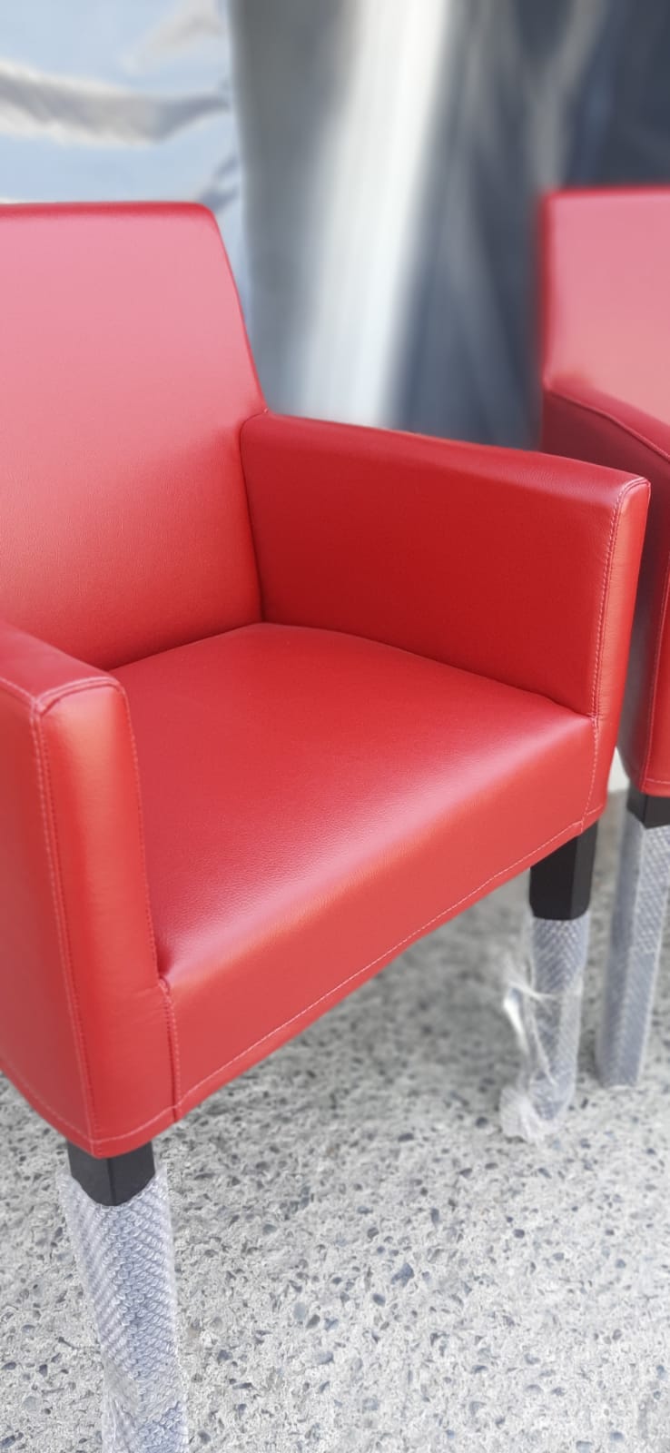 Poltrona Tapizada en Pu rojo hermosas, sus estilizadas Patas son de Madera de Alamo.