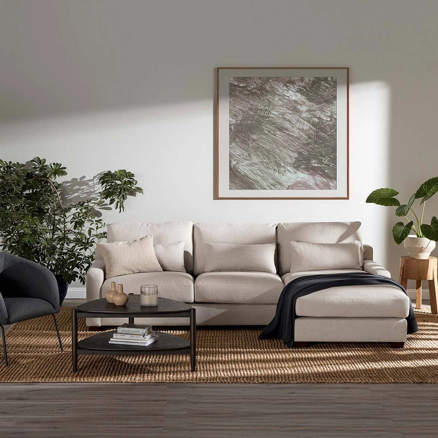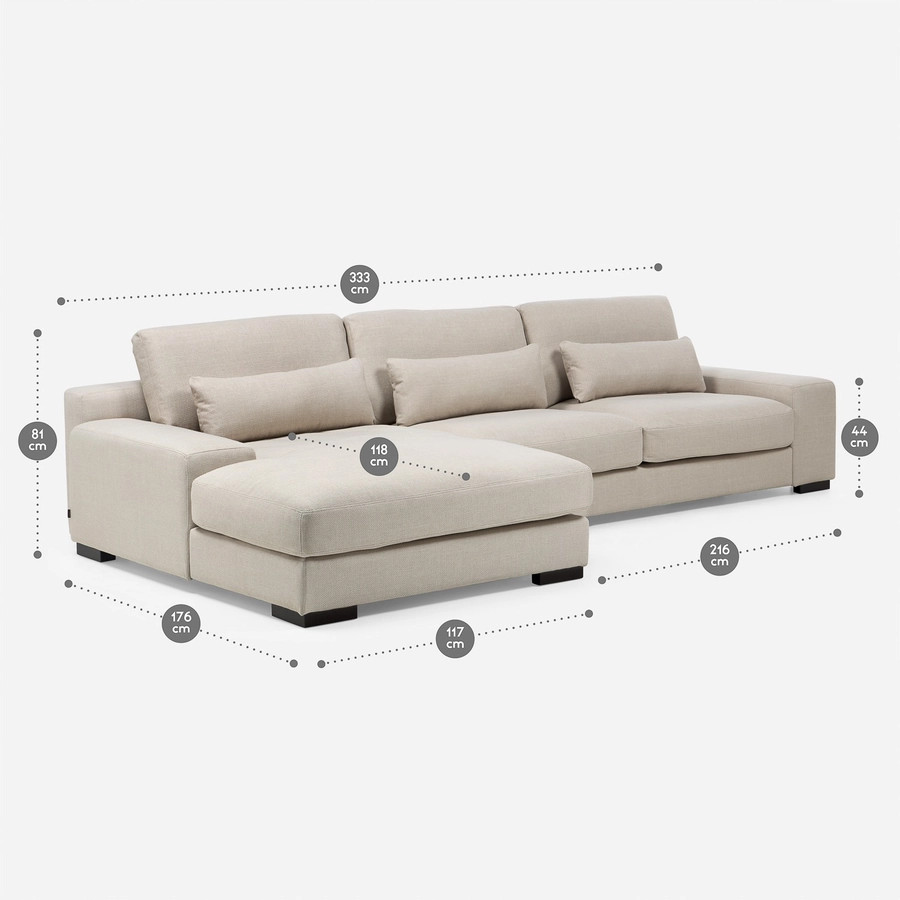 - Sofá: 216 x 104 x 81 cm- Ancho interior: 186 cm- Profundidad asiento: 50 cm- Chaise: 117 x 176 x 81 cm- Ancho interior: 93 cm- Profundidad interior: 118 cm- Altura estructura: 63 cm- Altura asiento: 44,5 cm- Ancho patas: 20 cm- Ancho brazos: 30 cm- Alto patas: 5 cm- Diagonal: 200 cm