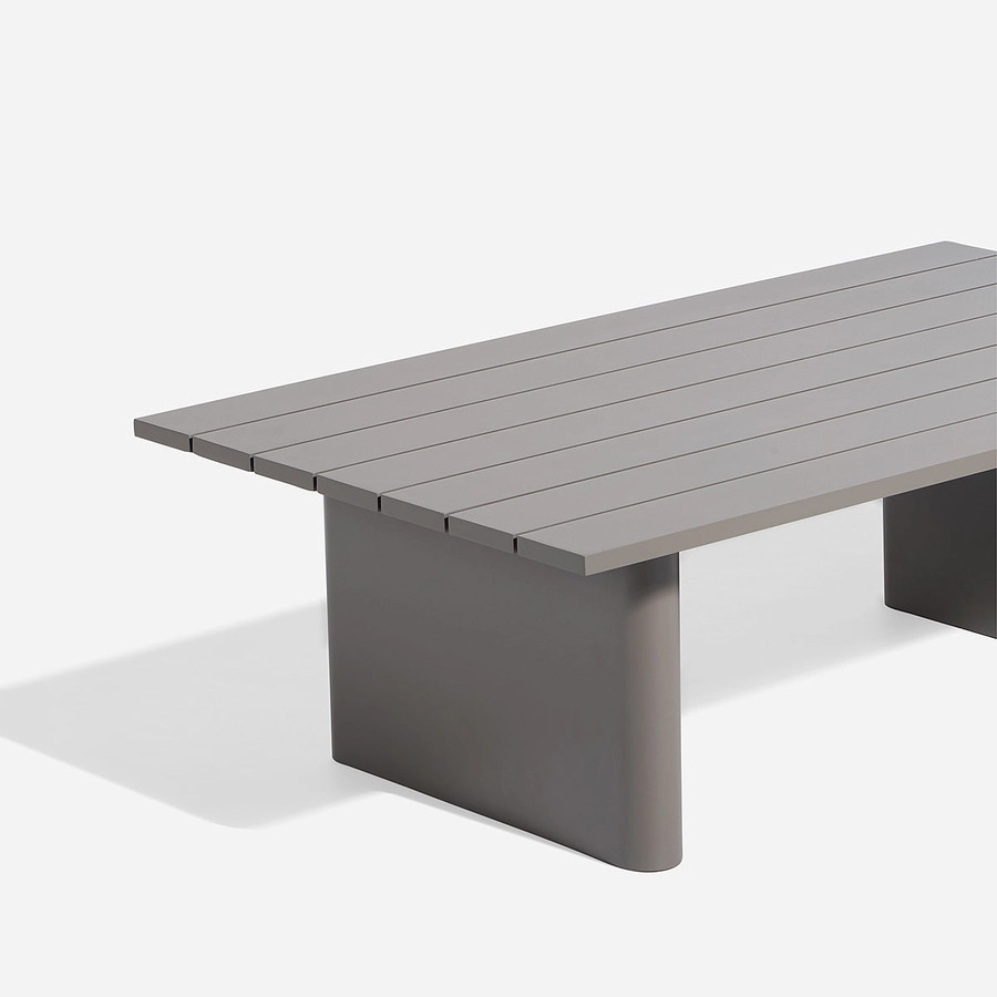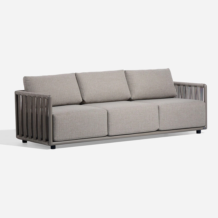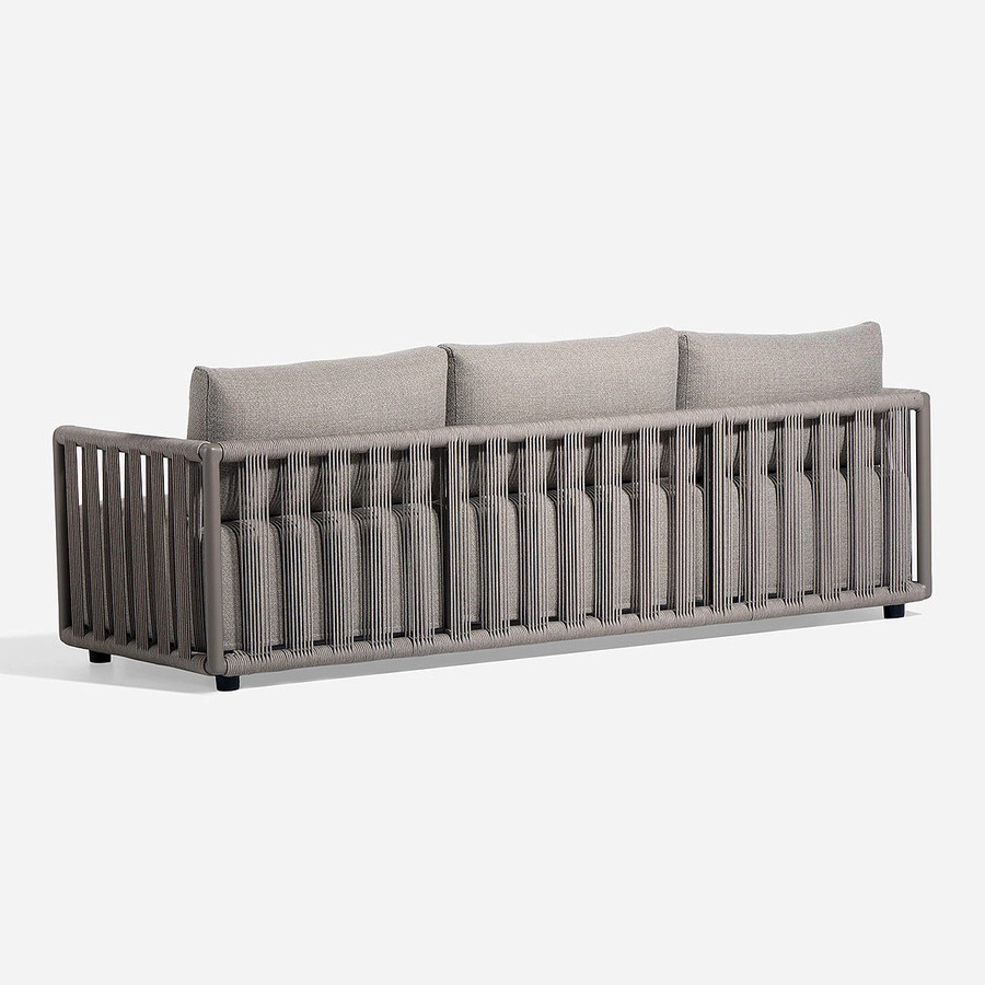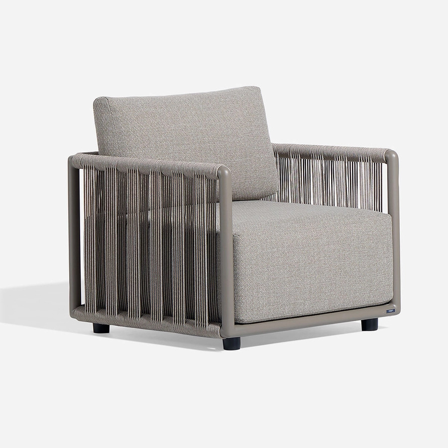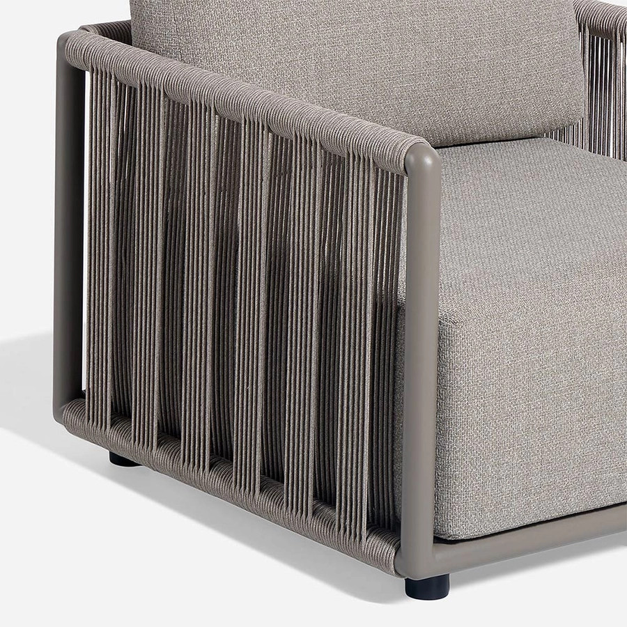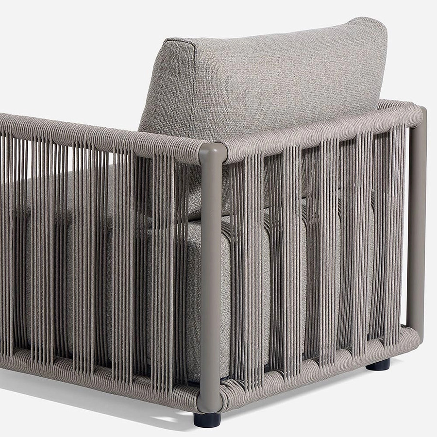 - Sillón y sofá: estructura de aluminio con pintura electroestática y cuerda en respaldo y laterales (trama tipo der en charcoal y lineal en taupe), cuenta con patín de plástico.