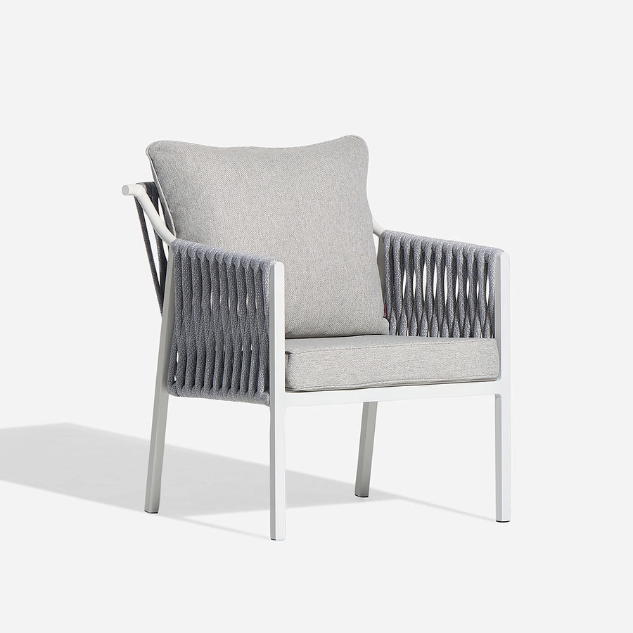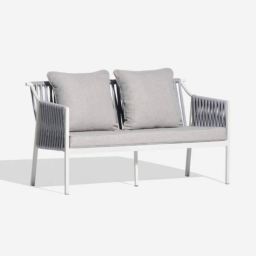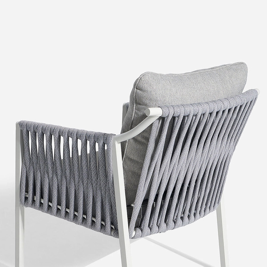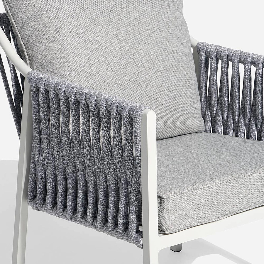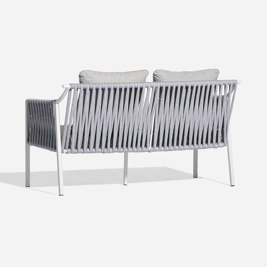 - Sillón y sofá: estructura de aluminio con pintura electroestática color blanco y cuerda plana en respaldo y laterales, cuenta con patín de plástico.