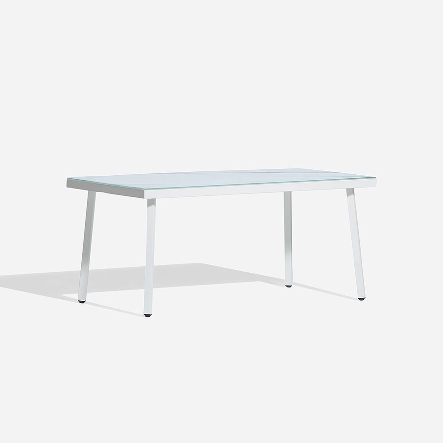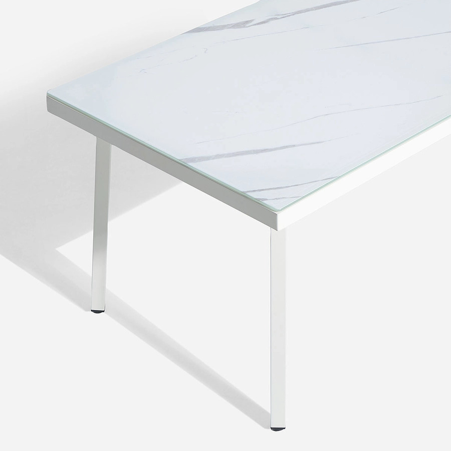 - Mesa: estructura de aluminio con pintura electroestática color blanco y cubierta de vidrio, patas con patín regulable.