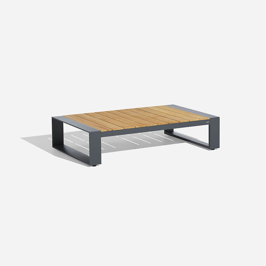 - Mesa: estructura aluminio de 1,5mm con pintura electroestática negra, cubierta de madera teca natural de 22 mm, acabado superficial con laca UV.
