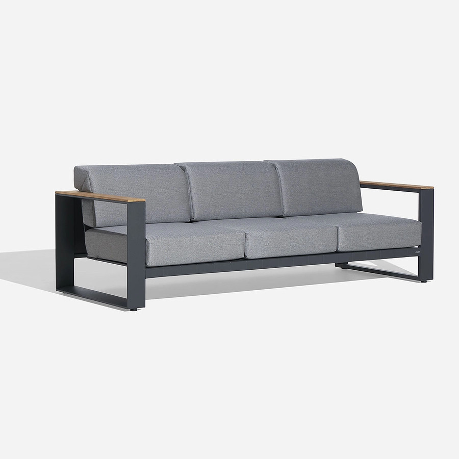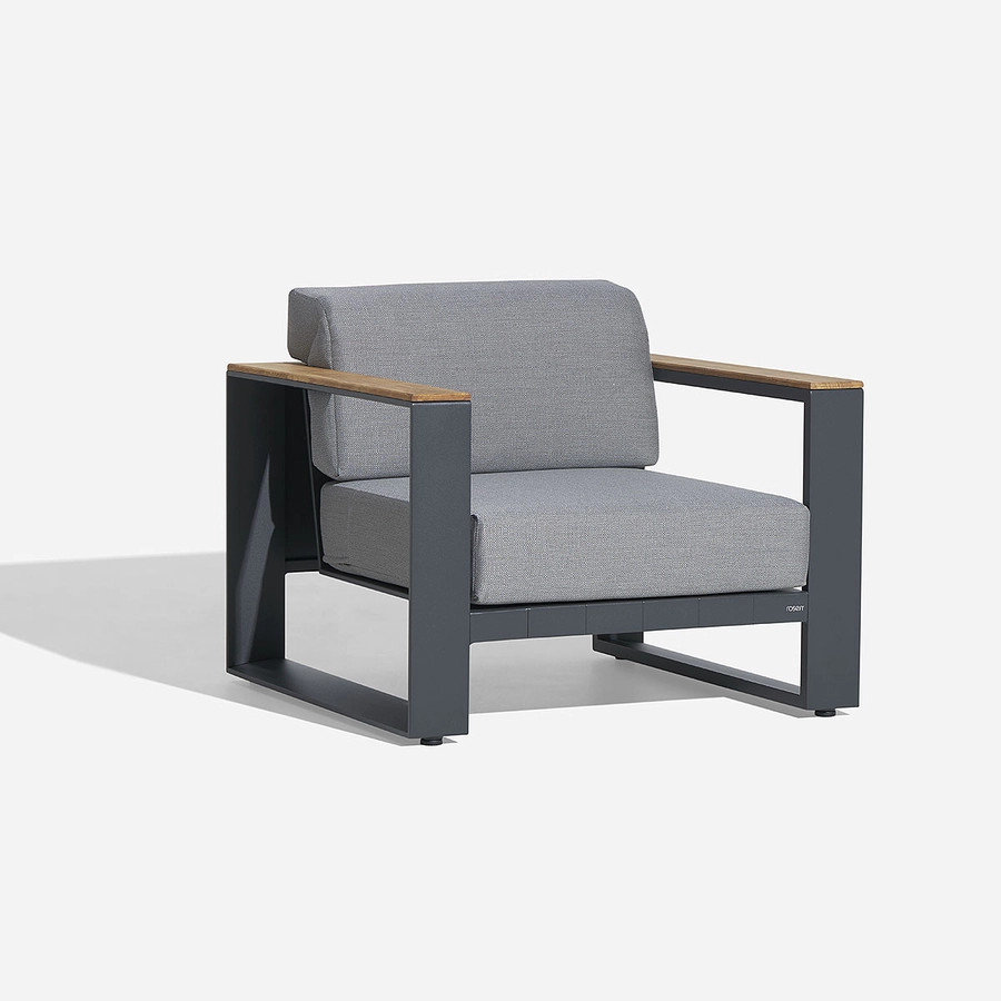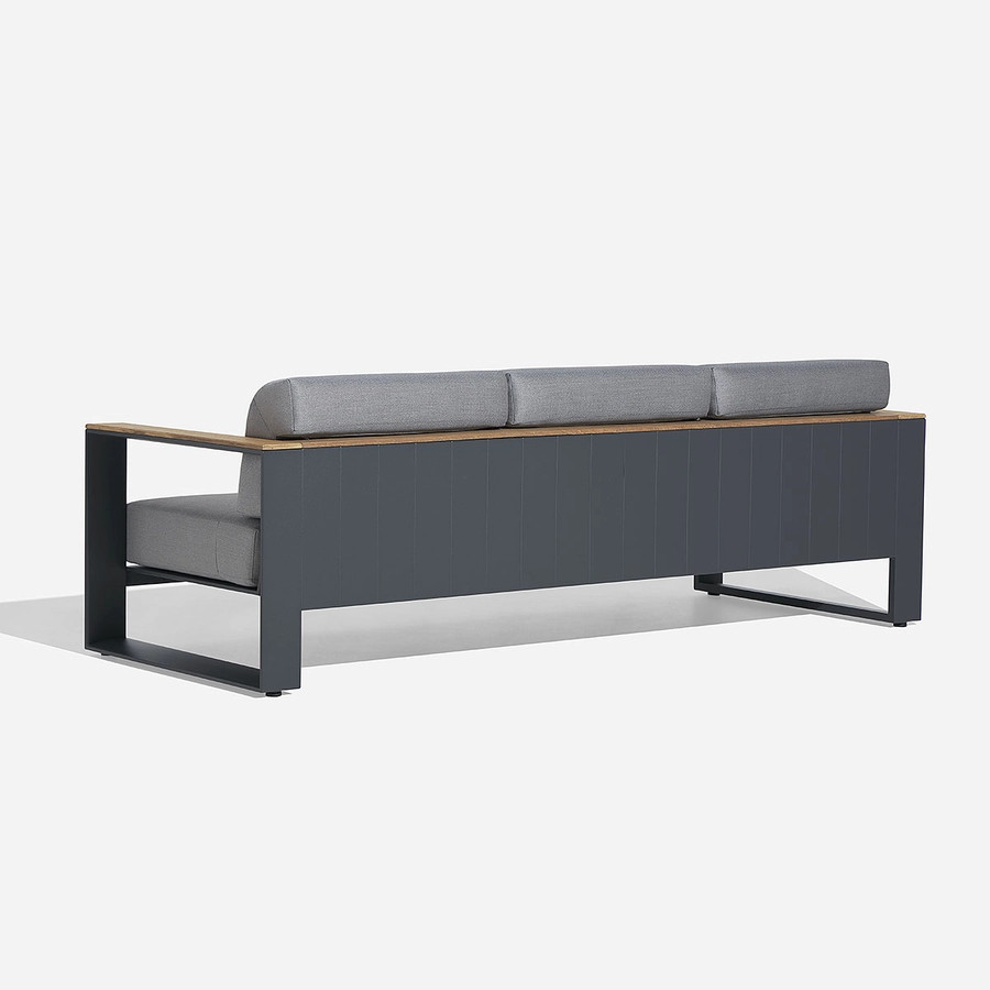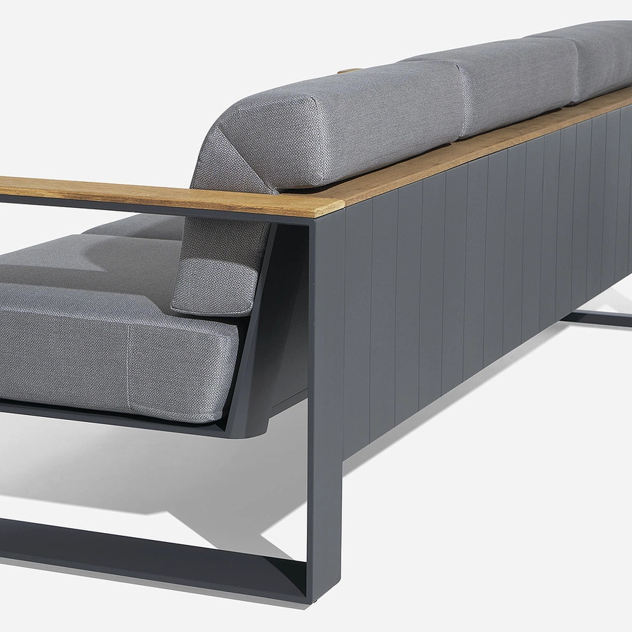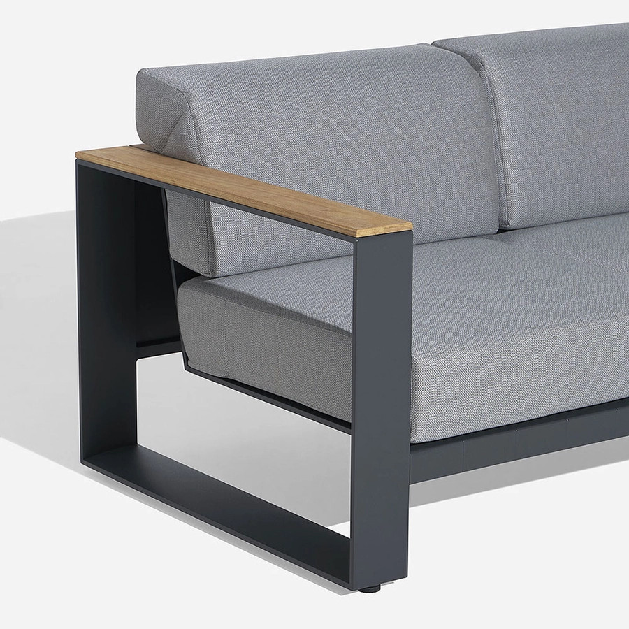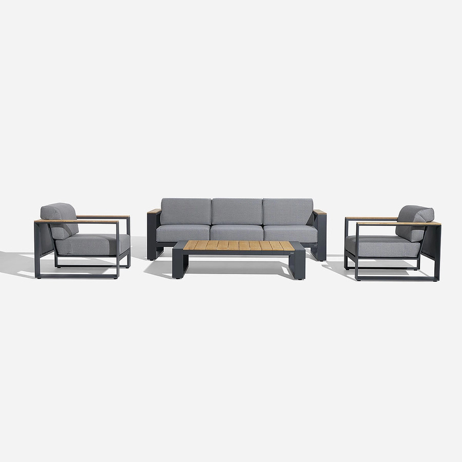 - Sillón y sofá: estructura de aluminio de 1,5 mm con pintura electroestática color negro, aplicación de madera natural de teca en apoyabrazos de 12 mm.