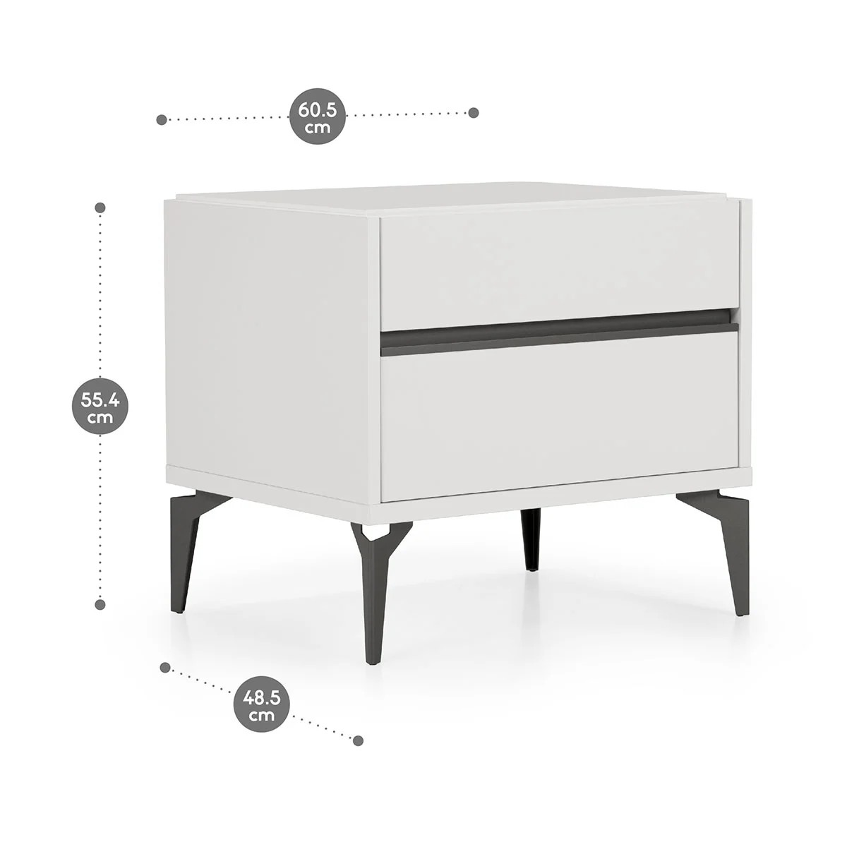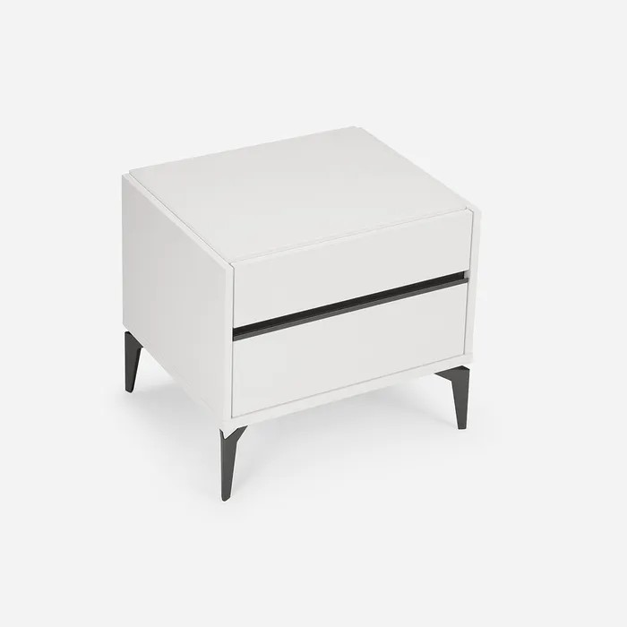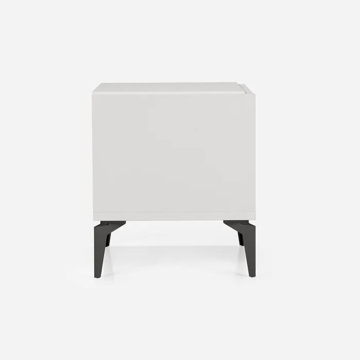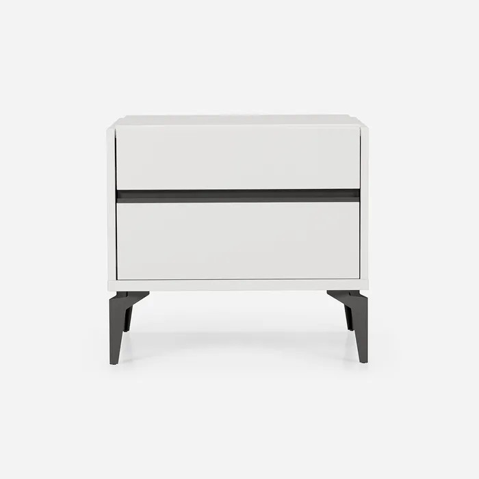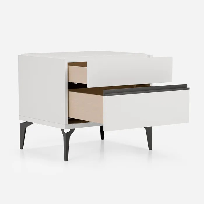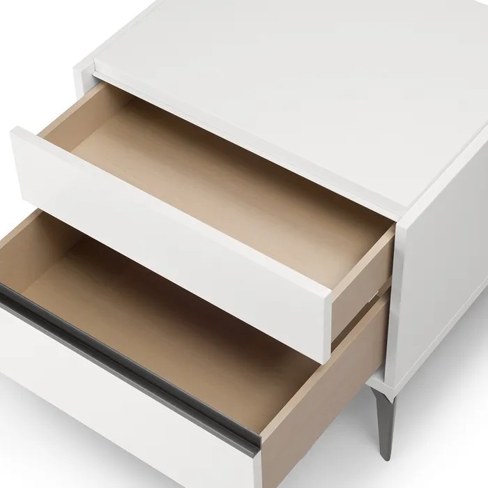 Cajones: Panel lacado blanco, con tiradores metálicos color negro, y rieles de corredera metálico.